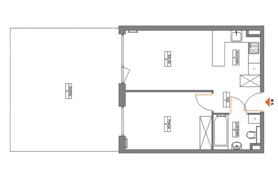 1 Hol 4,23 m2 2 Kuchnia 5,40 m2 3 Salon 15,63 m2 4 Pokój 11,33 m2 5 Łazienka 4,05 m2