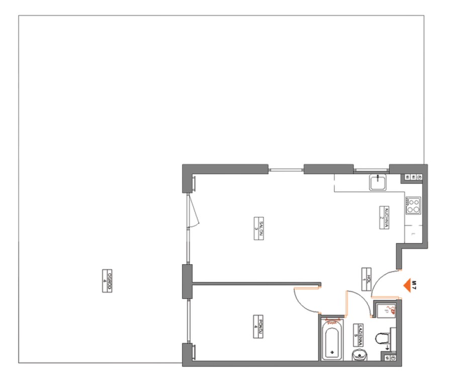 1 Hol z aneksem 4,98 m2 2 Salon 20,42 m2 3 Łazienka 4,77 m2