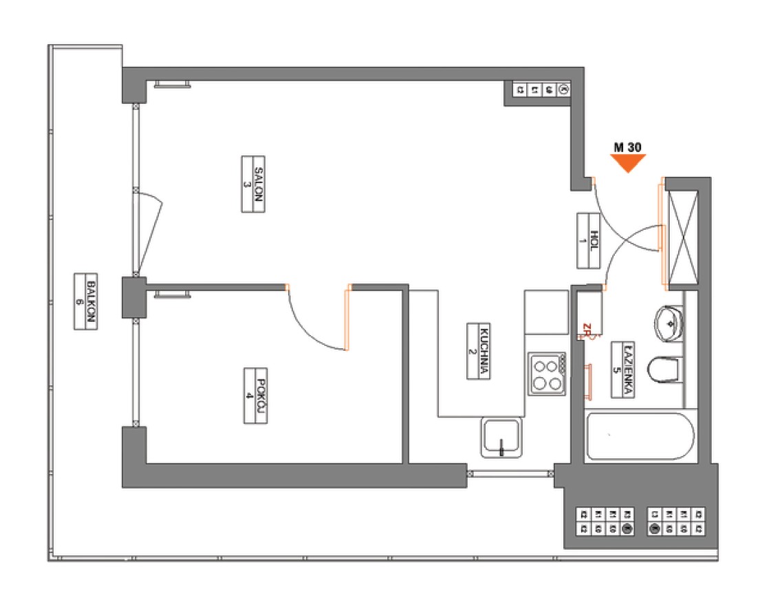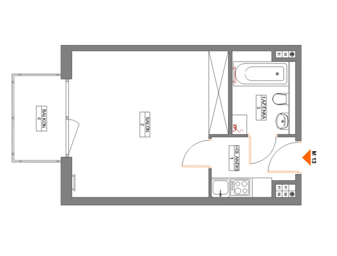 1 Hol 3,26 m2 2 Kuchnia 6,70 m2 3 Salon 13,53 m2 4 Pokój 13,04 m2 5 Łazienka 4,08 m2