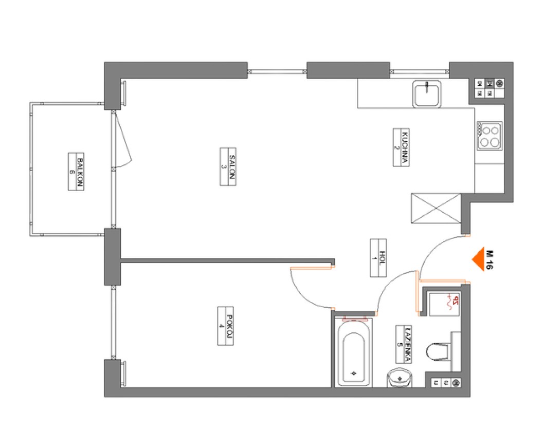 1 Hol 4,23 m2 2 Kuchnia 9,05 m2 3 Salon 16,08 m2 4 Pokój 10,92 m2 5 Łazienka 3,87 m2