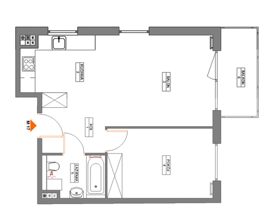 1 Hol 6,41 m2 2 Kuchnia 6,75 m2 3 Salon 17,06 m2 4 Pokój 12,08 m2 5 Łazienka 4,23 m2